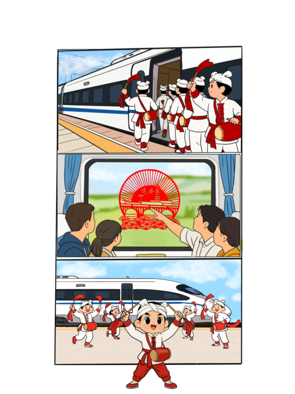 鼓点声声,是老区人民对美好生活的赞颂;高铁飞驰,助力革命老区谱写振兴发展新篇章。迈入“十五五”,期待西延高铁在时代浪潮中绽放出更加耀眼的光芒,让滚滚车轮承载着老区人民的幸福期盼,驶向更加繁荣富足、充满希望的明天。(文字:师龙飞、马喜;漫画:焦亚玲)