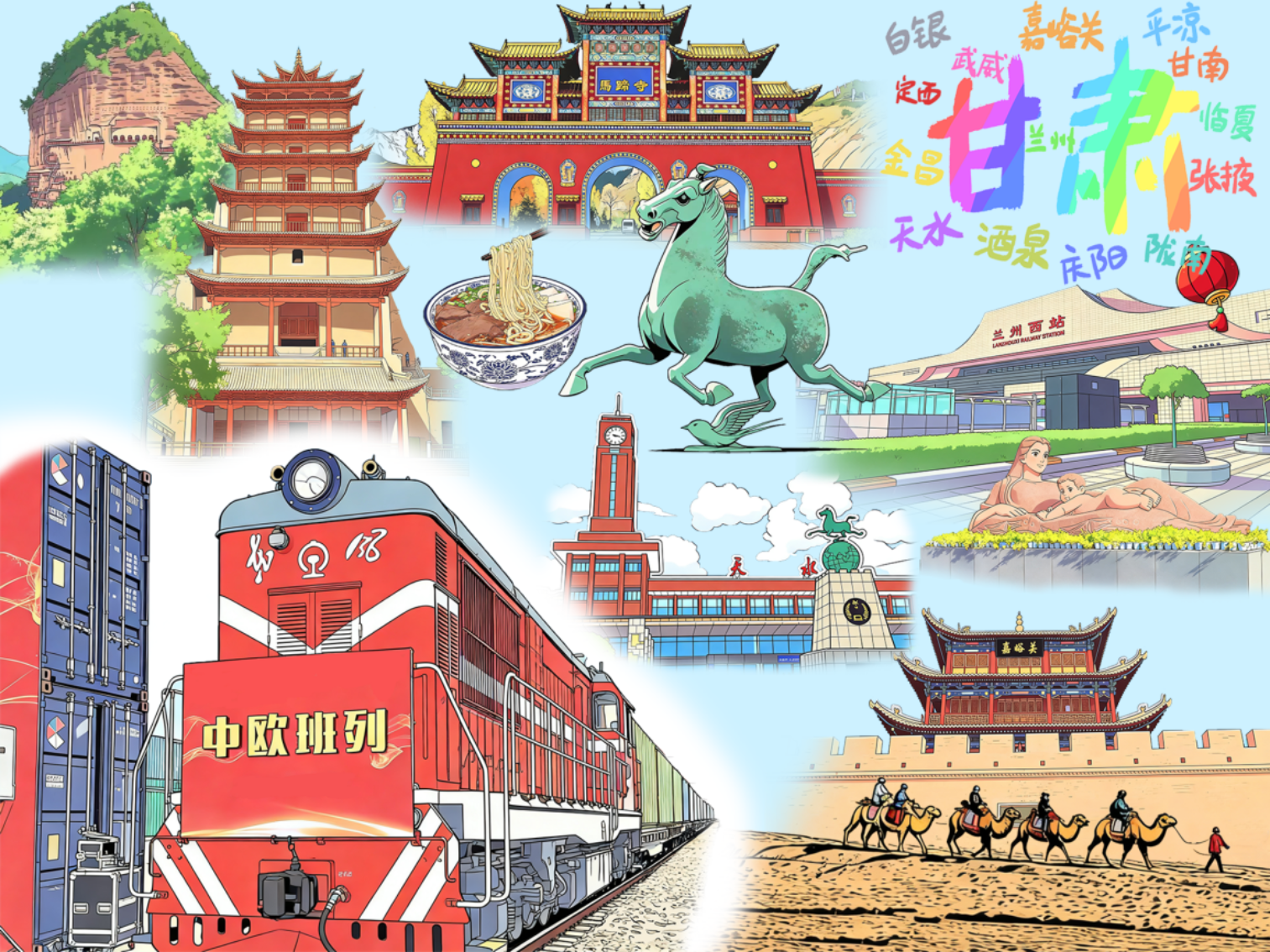 2026年春运,在甘肃这片土地上,铁路串联起的不仅是游子的归乡路,更是互联互通的贸易通道。从白山黑水到岭南大地,从天山南北到东海之滨,无数铁路人的坚守、无数趟列车的奔驰,共同汇聚成“流动中国”的动人图景。(文字:吴凯;AI漫画:曹鹏辉)