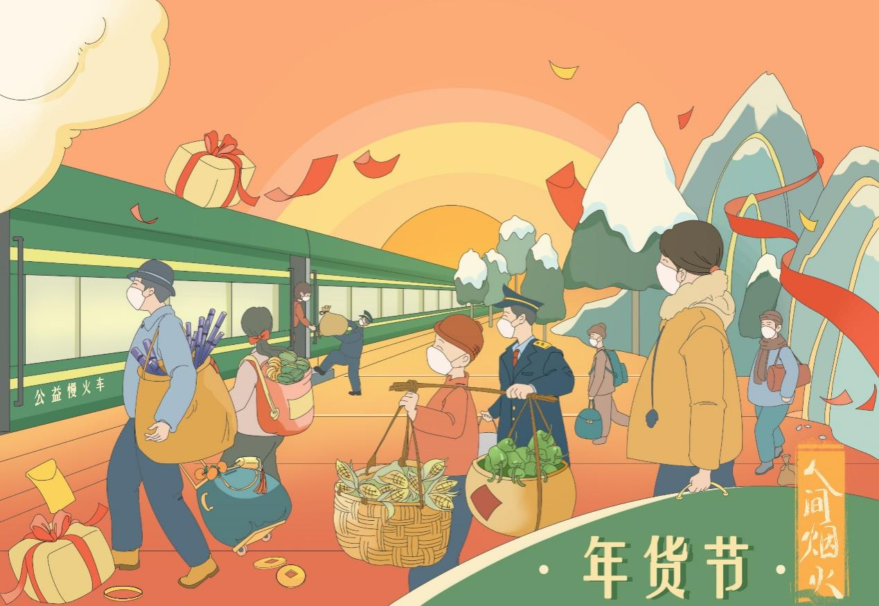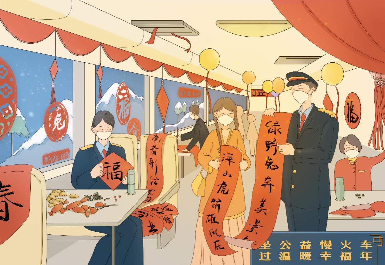 在大别山鄂豫革命老区,中国铁路武汉局集团有限公司常态化开行3对公益“慢火车”,满足沿线乡村群众出行、赶集、通勤、上学以及就医等需求。春节前,往返于湖北麻城和河南淮滨的8332/1次公益“慢火车”上,乘务员在车窗贴满了“福”字,小桌上摆放着花生、瓜子和糖果,乘务组现场书写春联和福字,车厢里弥漫着浓浓的春节气息,大别山革命老区的老乡们带着年货走亲访友,喜气洋洋。