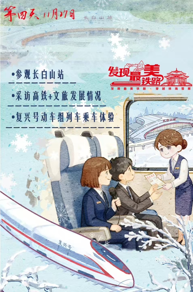 此次活动中,“发现团”成员将登上G8133、G3554次等复兴号动车组列车,穿行白山黑水间,探访沈白高铁为旅客出行、文旅融合、经济发展等作出的贡献,展现新时代铁路发展的“成就之美”。