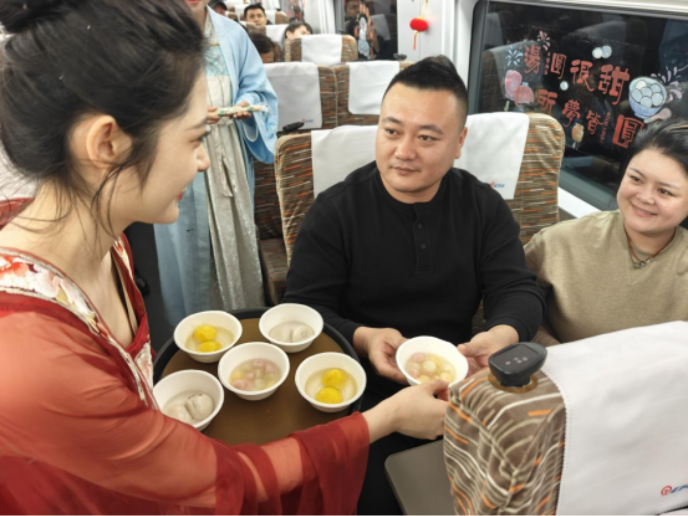 (G8157次列车上,身着传统服饰的乘务员为旅客端上热腾腾的汤圆)