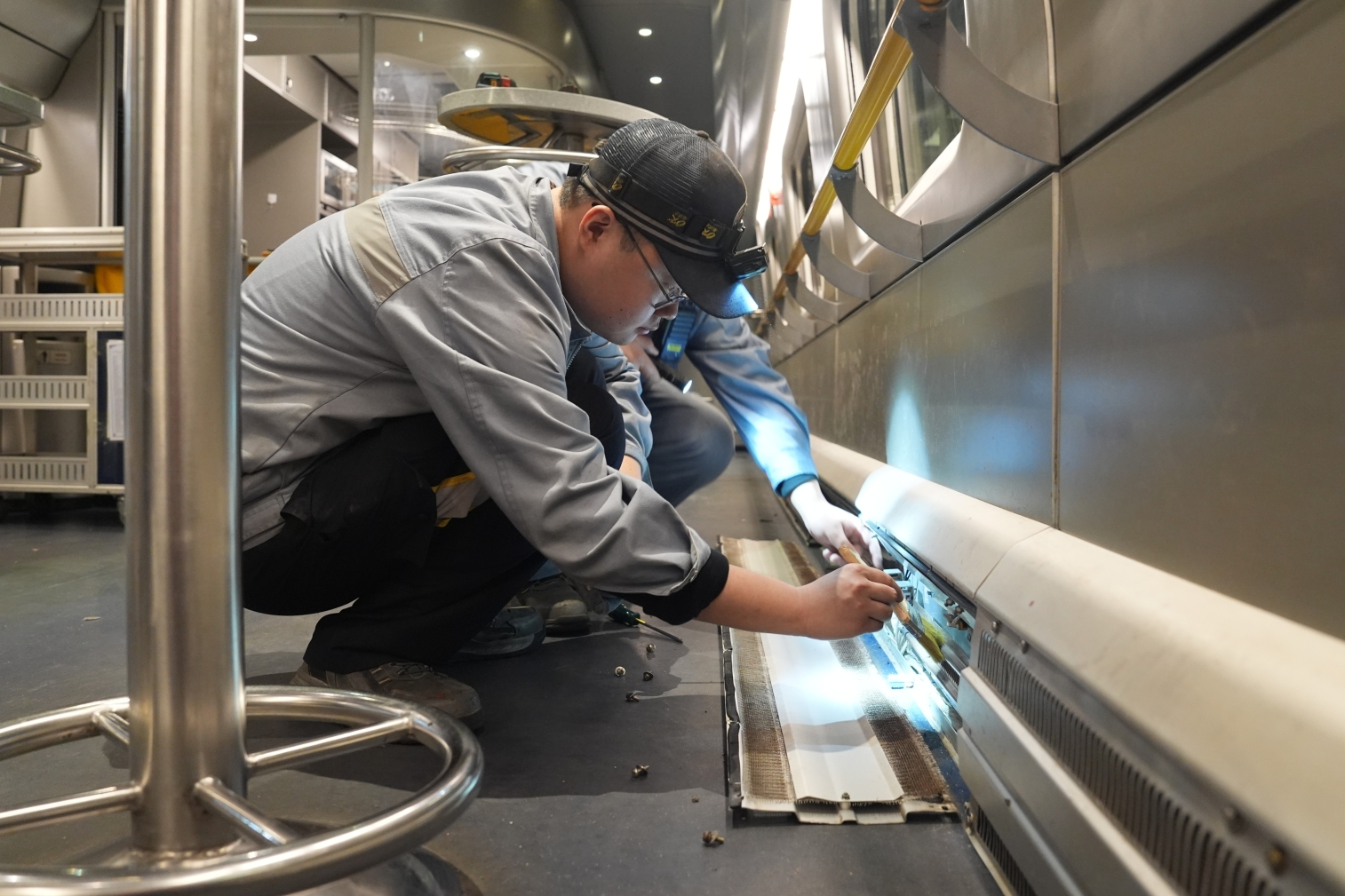 2026年春运前夕,包头车辆段呼和浩特东动车所对列车进行精检细修,以“绣花功夫”筑牢高铁运行安全防线。检修人员对动车组走行部、制动系统、空调采暖、电气设备等关键部位逐项“体检”,严格检查螺栓防松、车体密封、绝缘性能,做到不留死角、不留隐患。同时,检修人员对座椅、照明、卫生间等旅客服务设施进行精修细调,用严谨细致守护草原高铁安全畅通,护航旅客平安出行。(文字:包那日图;图片:张道勤)