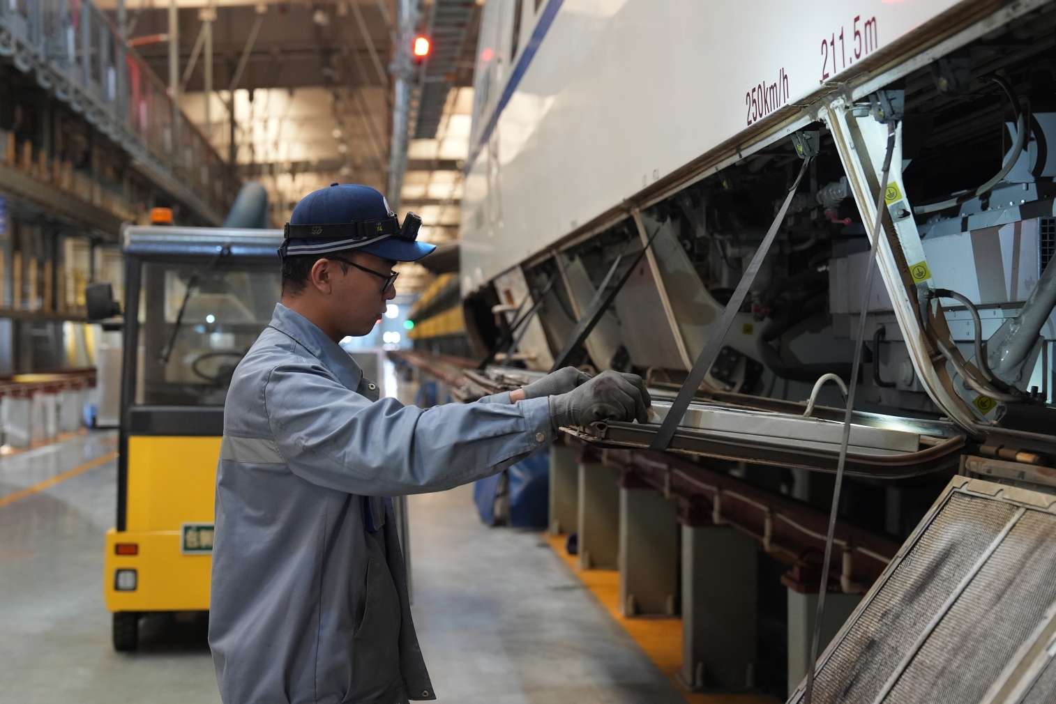 (动车组机械师检查受电弓性能状态是否良好。张道勤 摄)