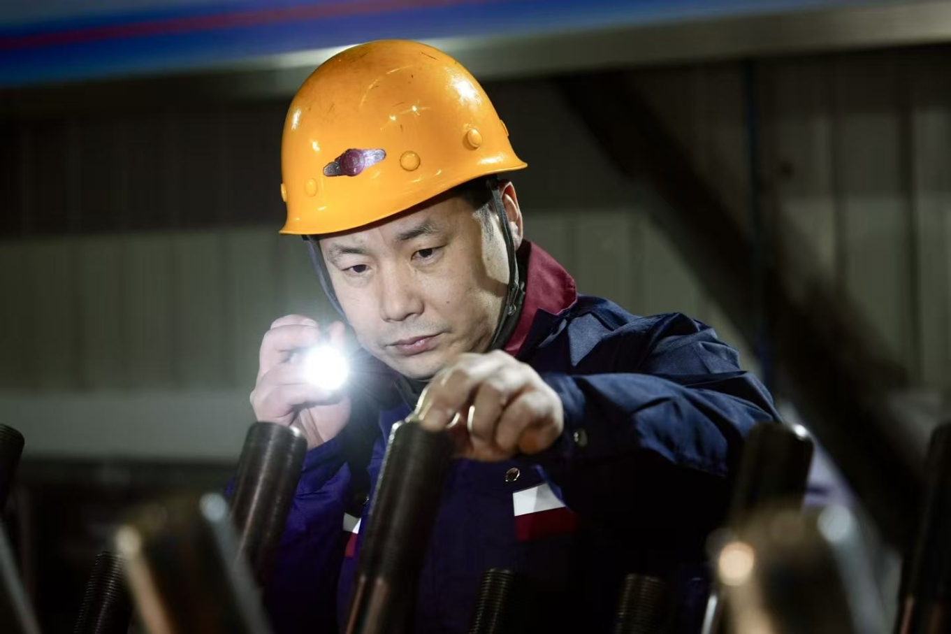 (大板机务段质检员对缸头螺栓进行检查。田得人 摄)