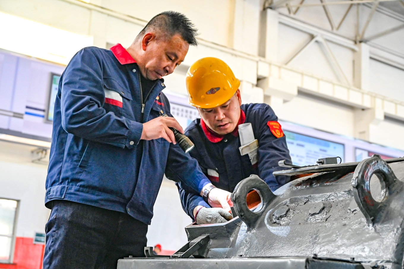 (大板机务段检修车间职工对走行部轴箱装置进行检查。牛鹏成 摄)