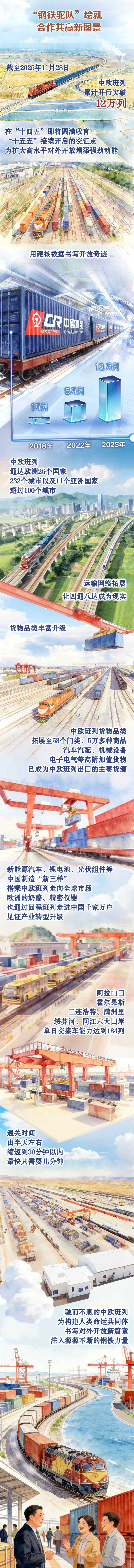 截至2025年11月28日,中欧班列累计开行突破12万列,勾勒出互联互通的壮丽画卷,见证中国与世界合作共赢的发展轨迹。