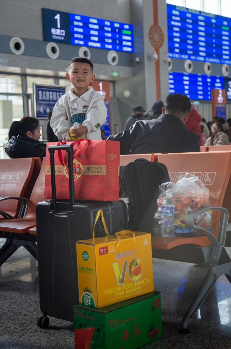 春运返程路上,家乡的特产让行囊沉甸甸、充满爱。巴彦淖尔站候车厅内,大人与孩子互动的温馨瞬间、阳光洒落的温暖角落……一个个鲜活的画面记录了旅途的忙碌,也传递着亲情的温度,展现着铁路服务的品质。行李中的“黄柿子”“西瓜”“葵花子”,是家乡的味道,更承载着家人的嘱托与奔赴未来的奋斗力量。(文字/图片:袁斌)