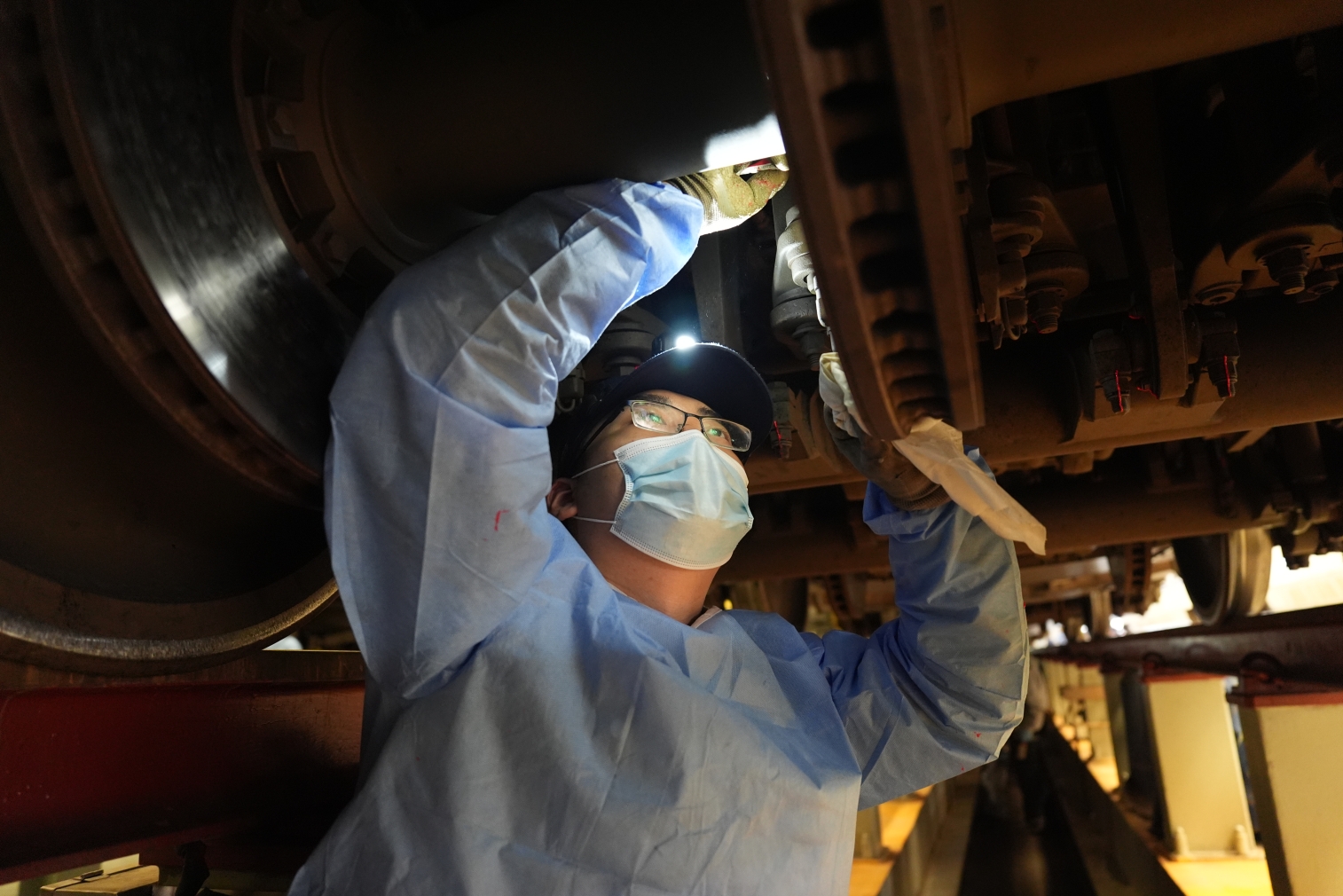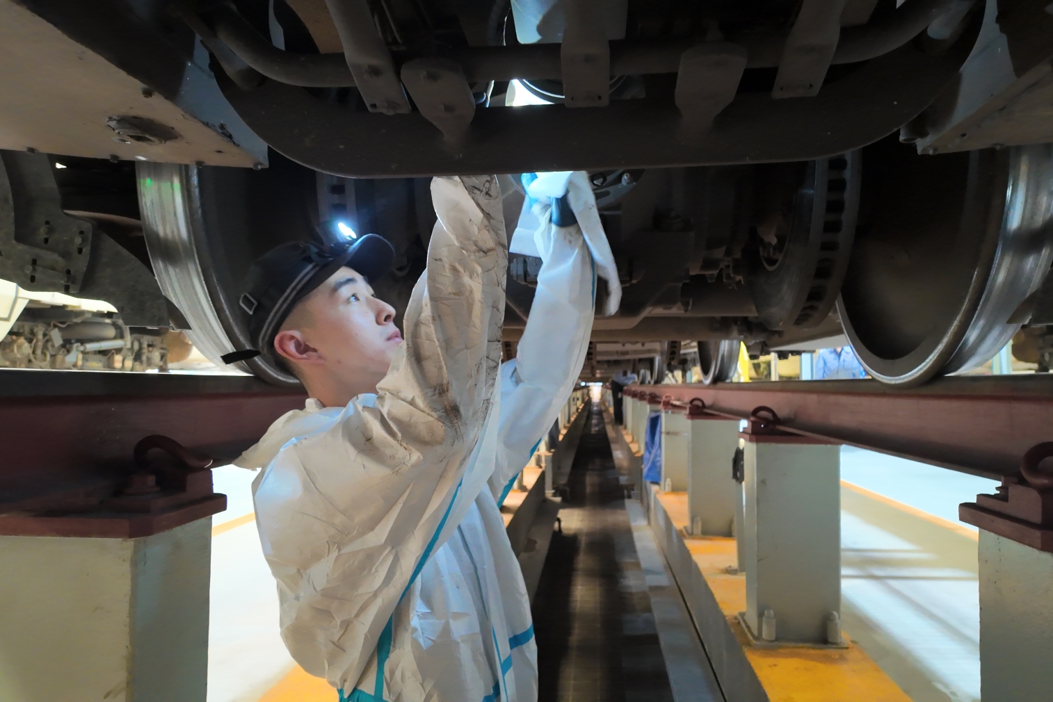 (动车组机械师正在对车底走行部进行细致检查。张道勤 摄)