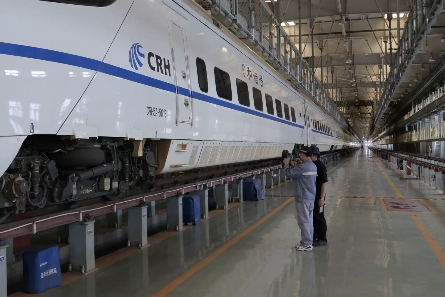 (包头车辆段机械师正在检查动车组转向架关键部件。张道勤 摄)