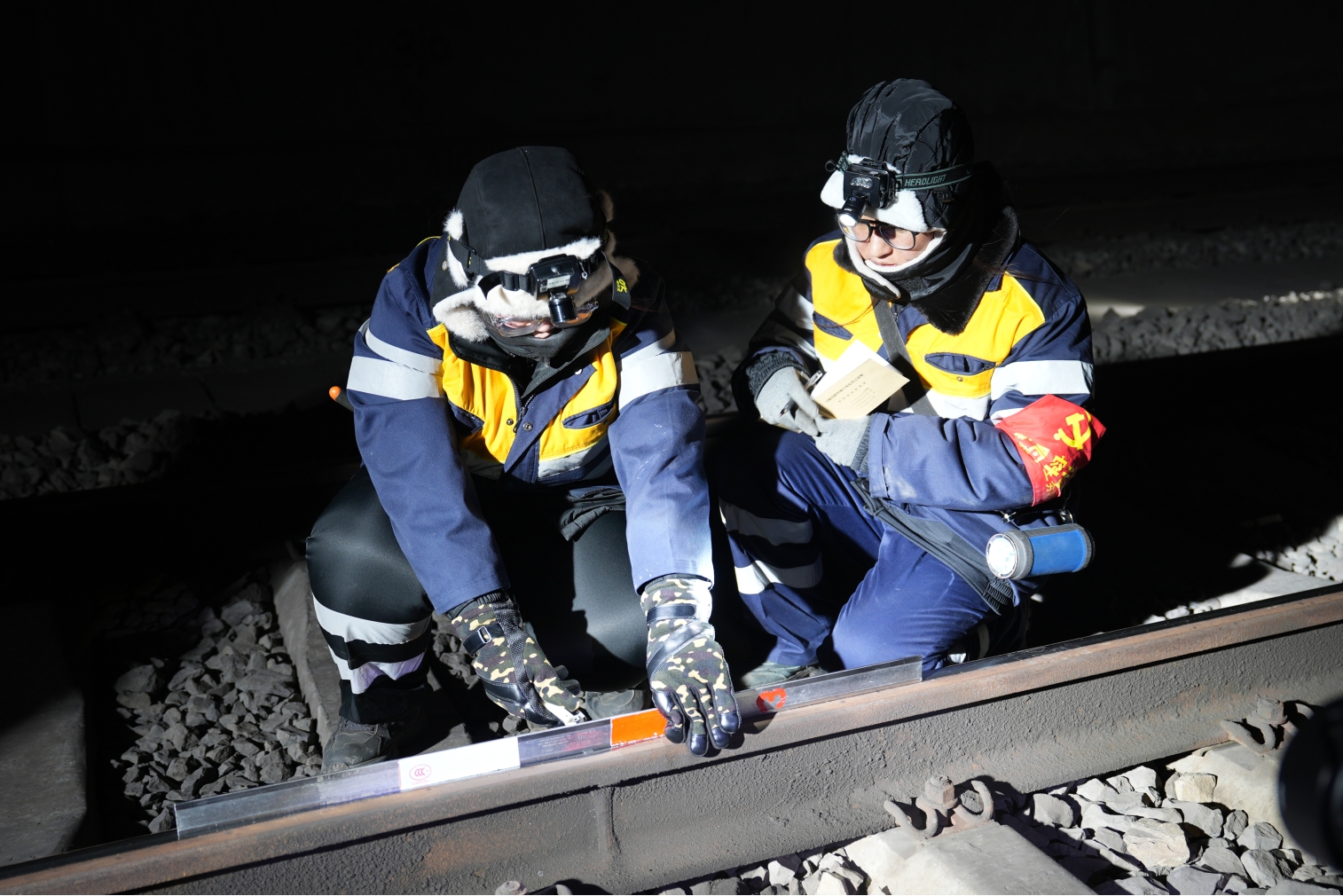 (深夜,女子质检组俯身查找钢轨病害,记录检查数据。张道勤 摄)