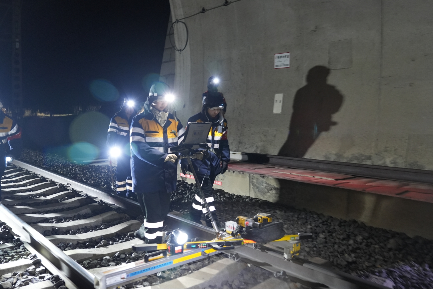 在零下20℃的草原深夜,国铁呼和浩特局集宁工务段女子质检组的7名“95后”姑娘迎着刺骨寒风,奔赴京包线卧佛山隧道,开展春运期间的线路检查作业。