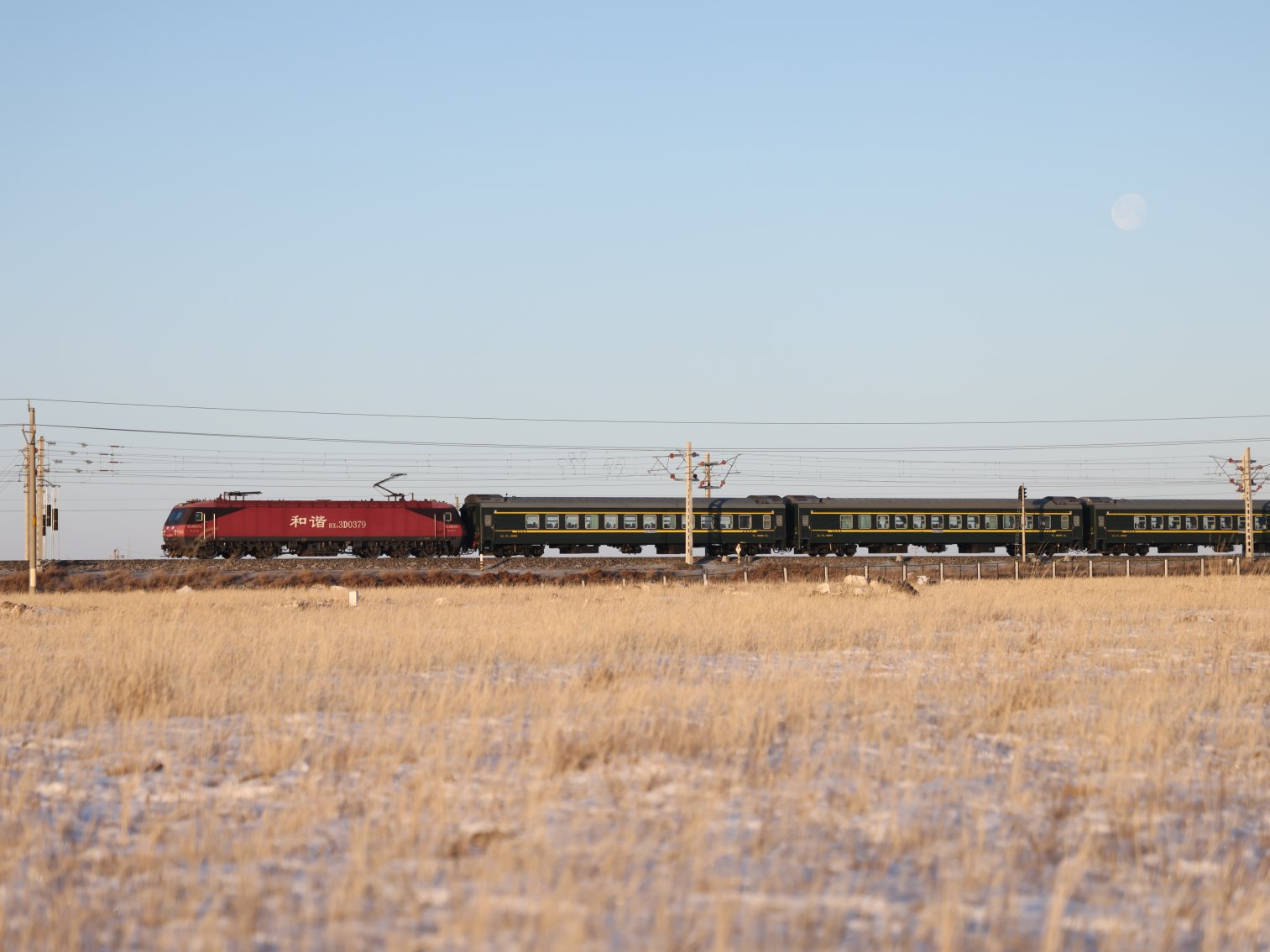 (一列“小慢车”行驶在冬天的锡林郭勒大草原深处。杨庆臣 摄)
