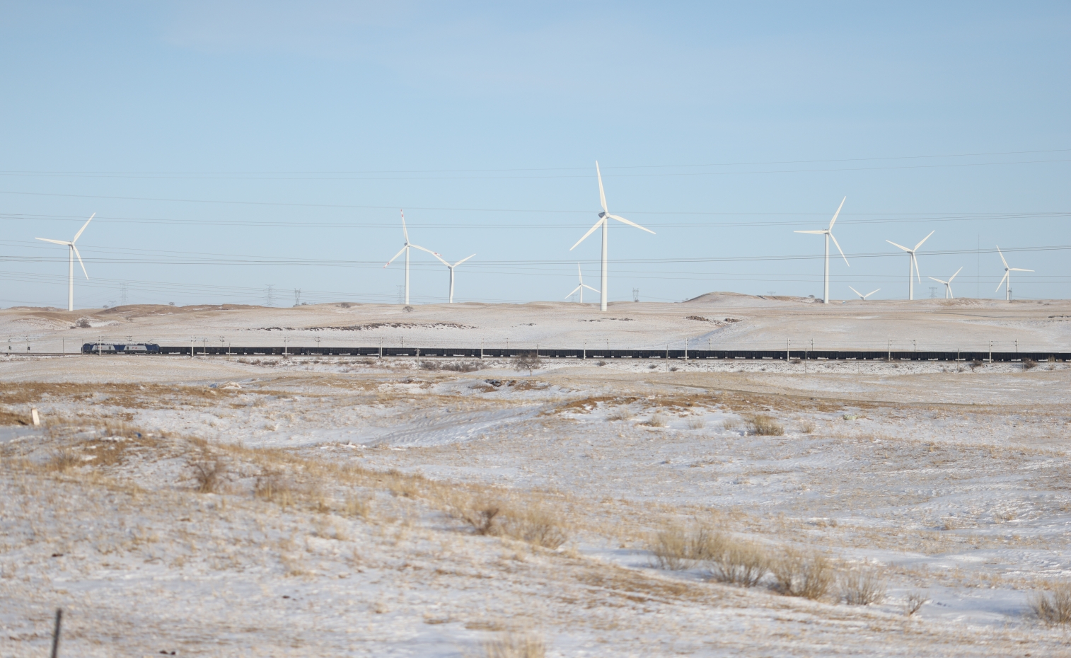 (“铁龙”与风力发电场“同框”。杨庆臣 摄)