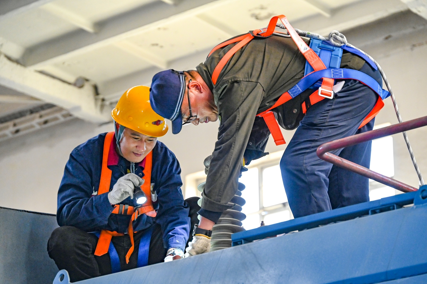 (大板机务段检修车间职工检查车顶设备。田得人 摄)